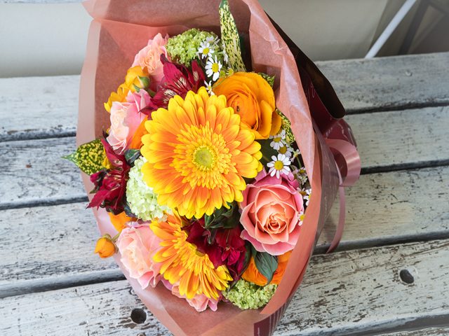 この華やかなブーケは、見た瞬間に心を温かくし、ウキウキワクワクとした気持ちを呼び起こします。