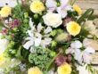 黄色、オレンジ、ピンクの花々がふわふわとしたアレンジで、まるで春の陽光を受けて踊るように生き生きとしています。